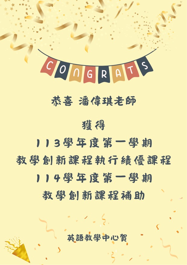 《賀》英語教學中心潘偉琪老師獲113學年度第一學期教學創新課程執行績優課程、114學年度第一學期教學創新課程補助