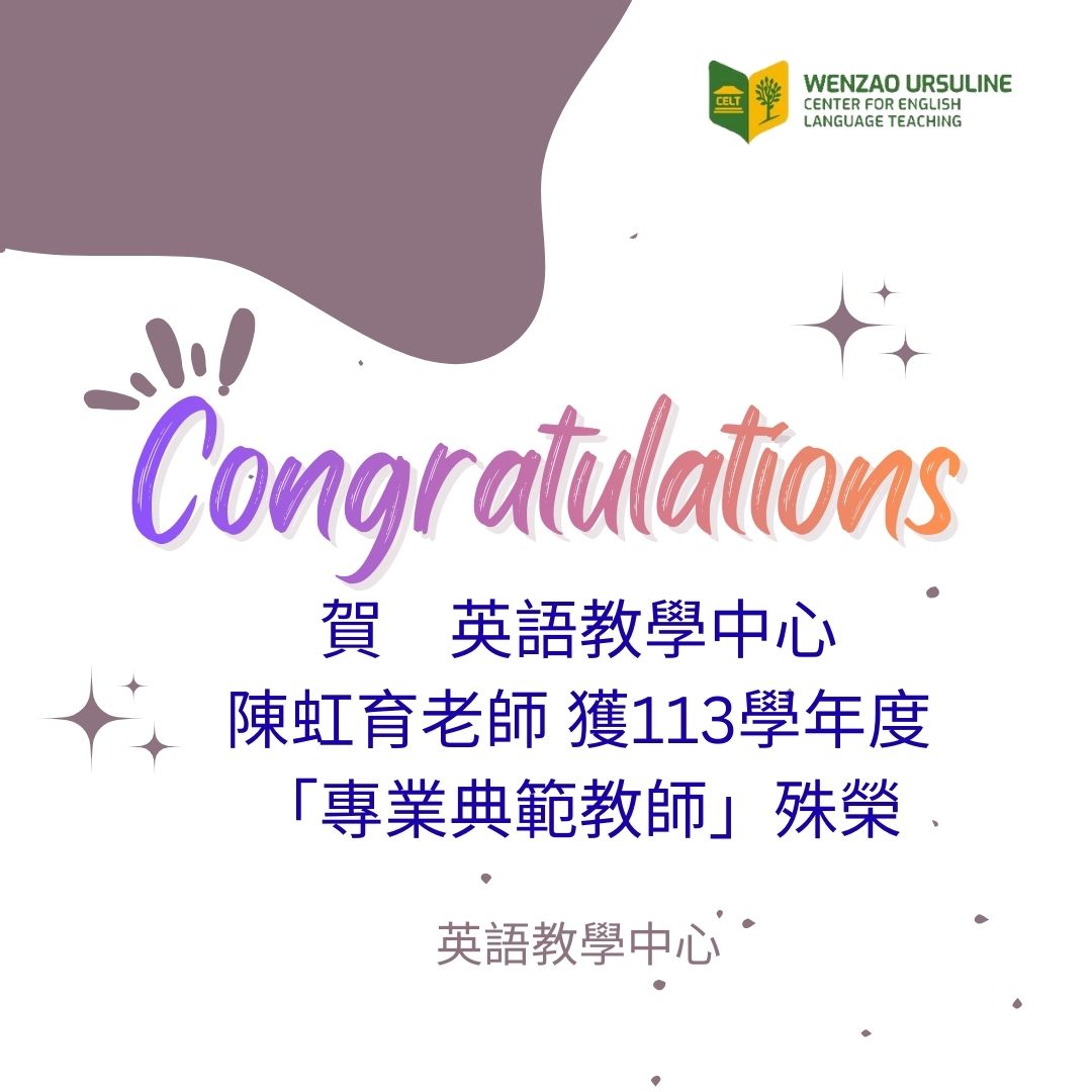 《賀》英語教學中心陳虹育老師獲113學年度「專業典範教師」殊榮!
